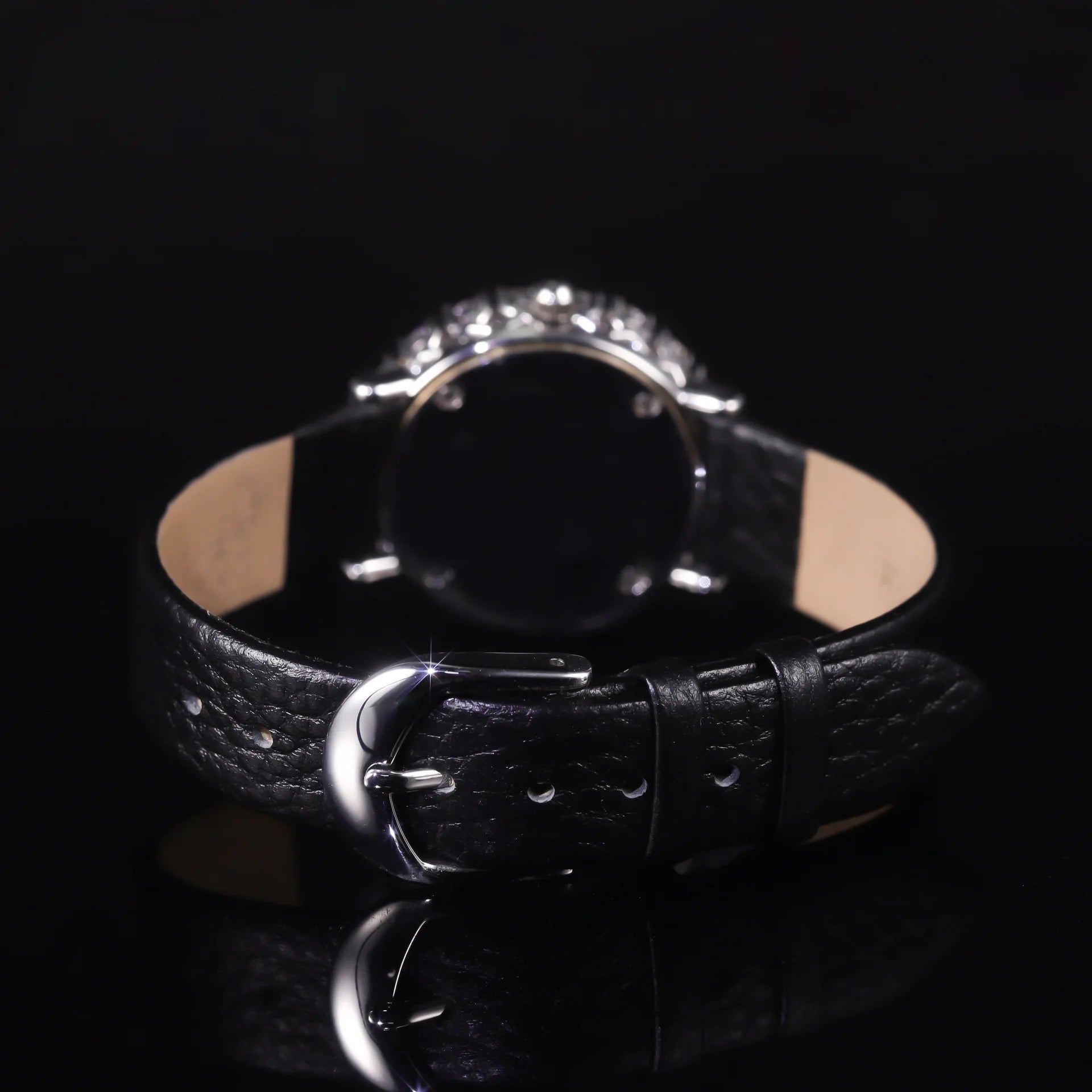 The Lustré Women’s Inlay Fashion Designer Watch brings together elegance and brilliance in one striking timepiece. Handcrafted with a solid 925 sterling silver case, this watch is adorned with dazzling VVS Moissanite stones, meticulously inlaid to create a radiant halo of light around the dial. Each stone is precision-cut to capture the fire and sparkle of natural diamonds, ensuring your wrist catches attention from every angle. Paired with a sleek, textured leather strap for comfort and durability, this designer watch is the perfect blend of luxury and modern fashion. Whether worn daily or reserved for special occasions, it’s a bold statement piece designed to elevate any look.